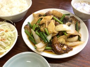 にんにくの芽とレバー炒めの定食、五目焼きそばを。にんにく効いてて美味かった!